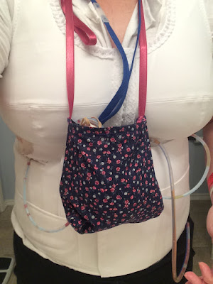 One thing I read a lot about was drain management. Those stinkin' JP Drains become truly annoying after awhile. Almost every blog post or list you read recommends some type of "drain holder". My Great Aunt mailed me a "drain pocket" that she received as a gift before her mastectomy and one of the sweet ladies in the Sewing Circle and my parent's church made me a "drain apron". The hospital provided lanyards and rubber bands as their solution. There are pros and cons about all three and I used all three at different times. Here's my take on drain management: